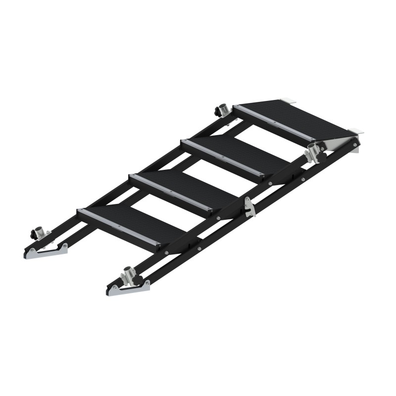 Sa largeur de 75 cm permet un passage aisé, tandis que le revêtement antidérapant (finition Hexa) assure une adhérence maximale dans toutes les conditions, même sous les projecteurs ou en extérieur. Les garde-corps latéraux se fixent solidement à l’armature, offrant une protection anti-chute indispensable pour répondre aux réglementations de sécurité des établissements recevant du public (ERP). C’est l’outil de liaison structurelle stratégique qui sécurise l’accessibilité de vos plateaux les plus hauts. Sa structure noire mate s’intègre avec discrétion et élégance le long de vos praticables.
