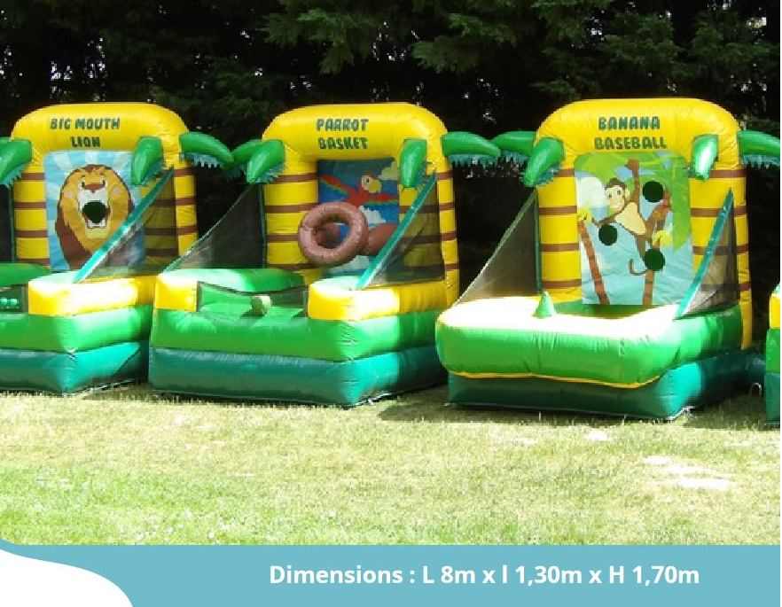 Pour offrir une activité ludique et thématique sans l’encombrement d’un château géant, louer le Jeu de Kermesse Jungle est le choix de la flexibilité. Ce module unique a été conçu pour s’intégrer facilement sur un stand de kermesse, dans un jardin ou dans une salle des fêtes. Son design immersif, peuplé d’animaux de la jungle, stimule l’imaginaire des enfants tout en les invitant à participer à un jeu de précision ou de franchissement.