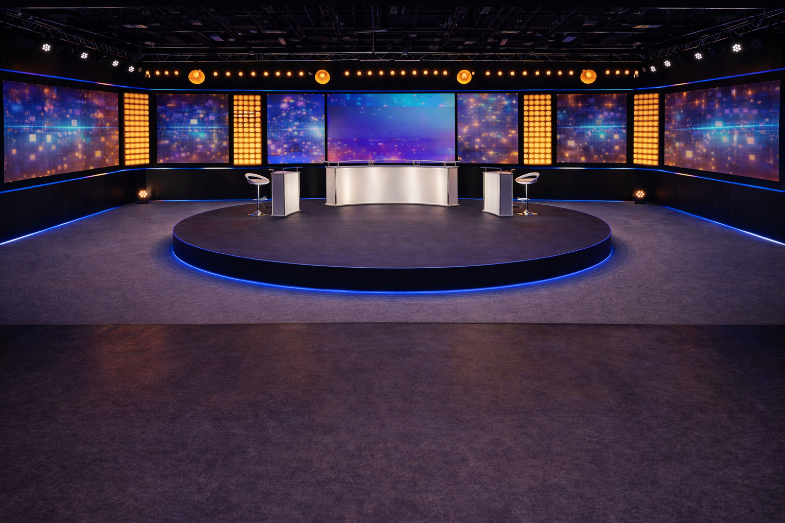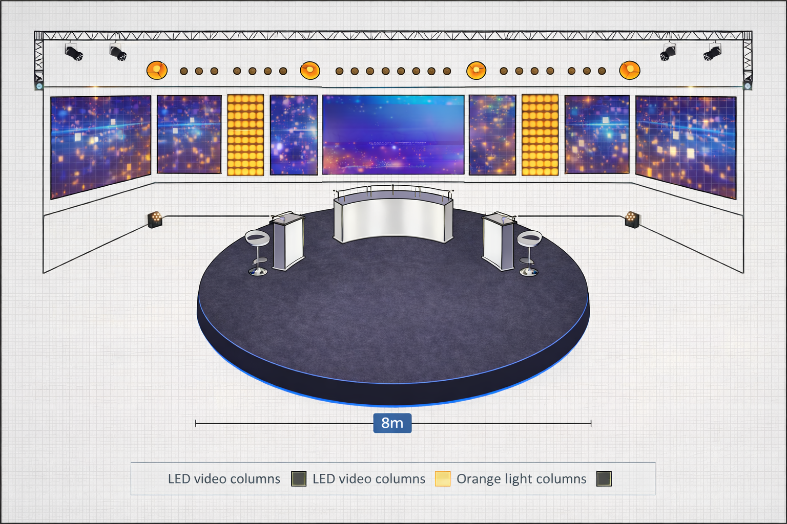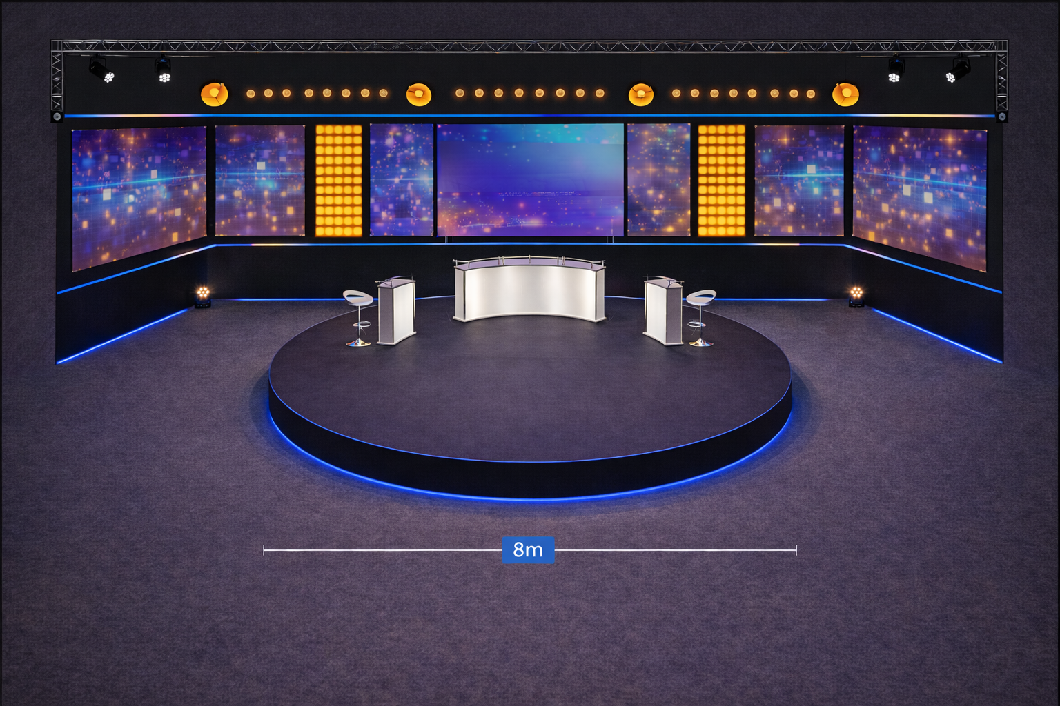 Ce plateau talk-show propose une scénographie immersive et contemporaine, pensée pour la télévision, le streaming et les événements corporate. L’espace s’articule autour d’une scène centrale ronde de 8 mètres de diamètre, surélevée à 60 cm, offrant une visibilité optimale et une forte présence visuelle à l’image. Son contour est souligné par un ruban LED, renforçant l’effet de flottement et la lecture du plateau en multicaméra.